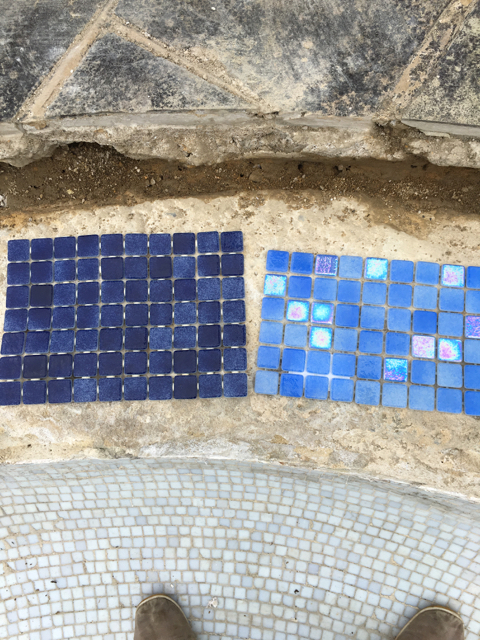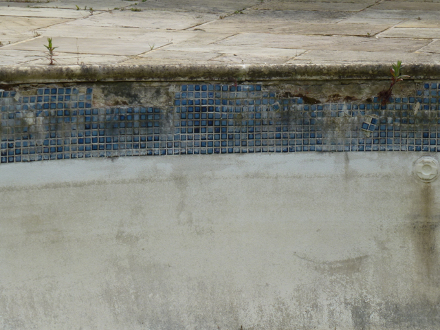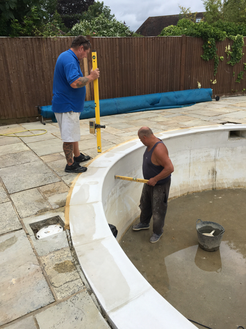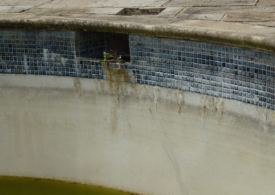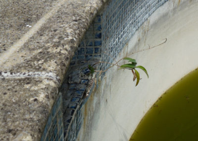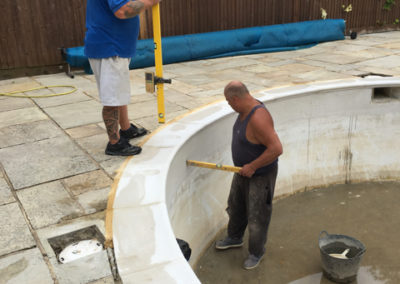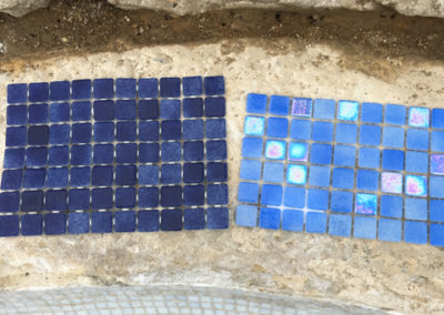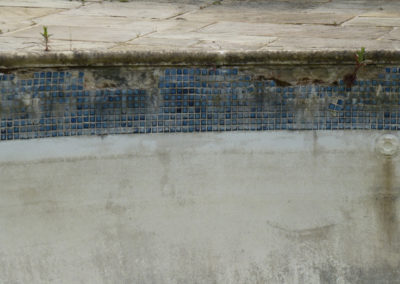 As you can see from the pictures below, the previous refurb included tiling over the original tiling without correct preperation resulting in the new tiles lifting. Weeds were growing out of a number of tiled areas, the coping stones we loose, paving discoloured and once we lifted the copings, found that the supporting ring beam had started to disintegrate and had to be replaced. All of the old tiles were removed and the underlaying render thoroughly prepared and repaired to ensure that the pool has a long future ahead of it.
