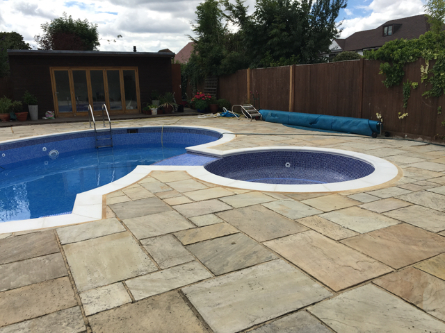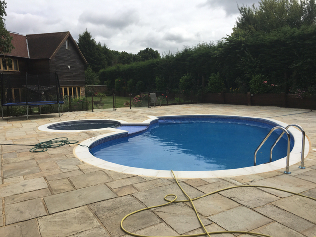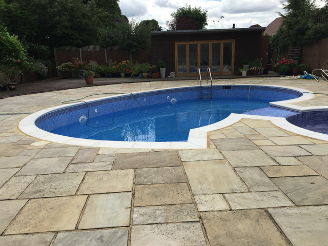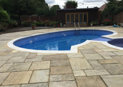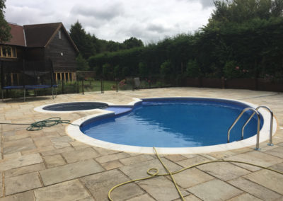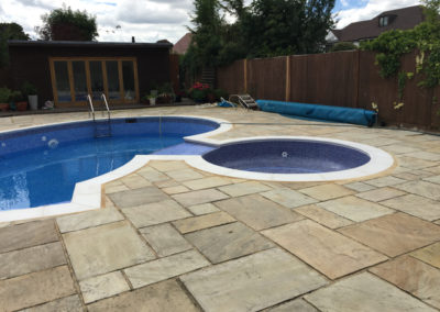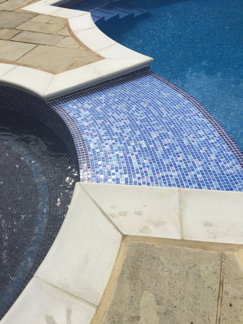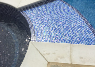 The pool and attached spa were originally of Marblelite construction with a tile band above and fully tiled ‘spill over’ between the spa and pool creating a waterfall effect. After discussion with the customer it was decided to fully tile the pool and spa, replace the copings and jet/acid wash the paving.